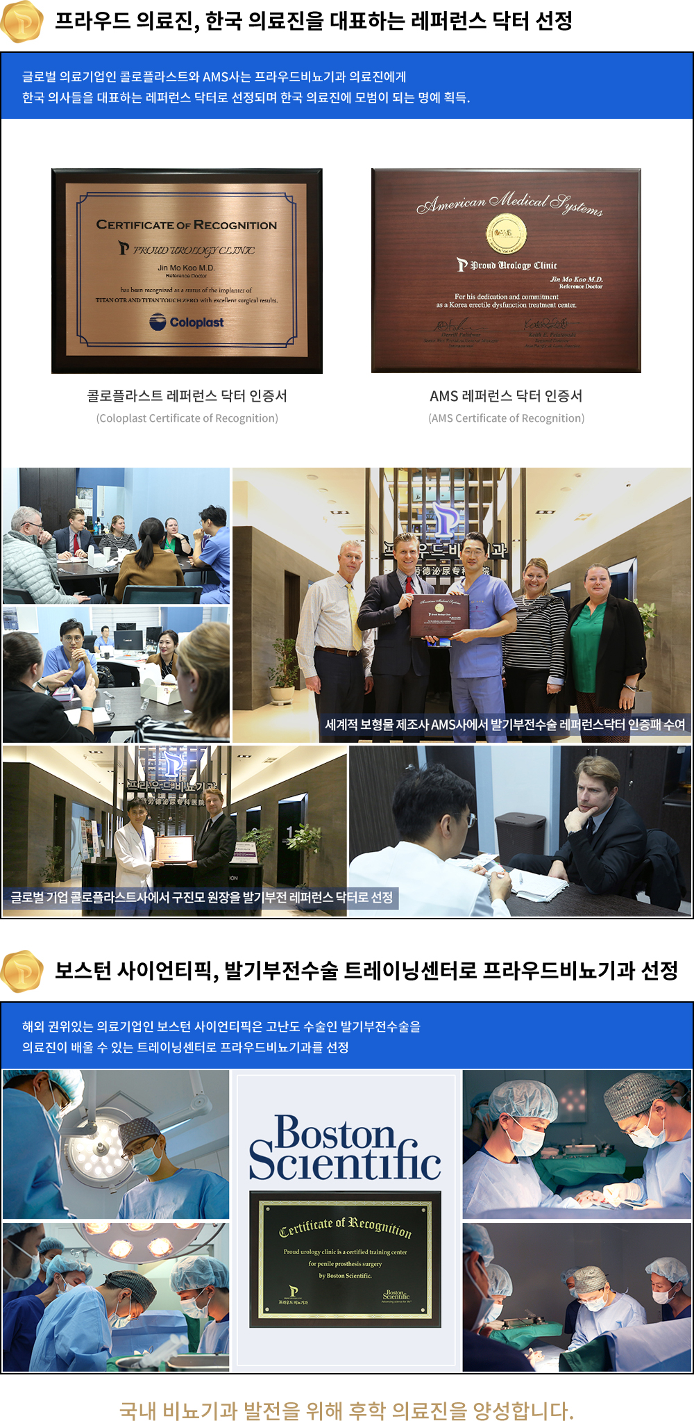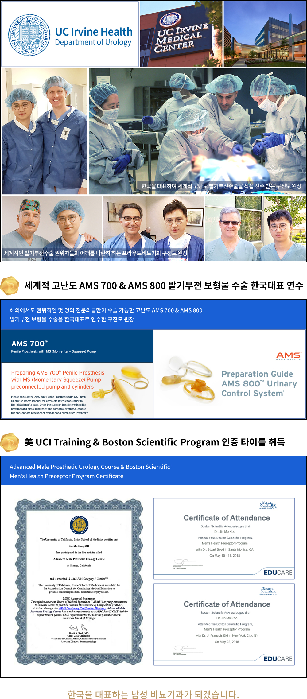 세계적인 권위자들과 함께 AMS 700, AMS 800 발기부전 보형물 수술 기술 및 시스템 취득.